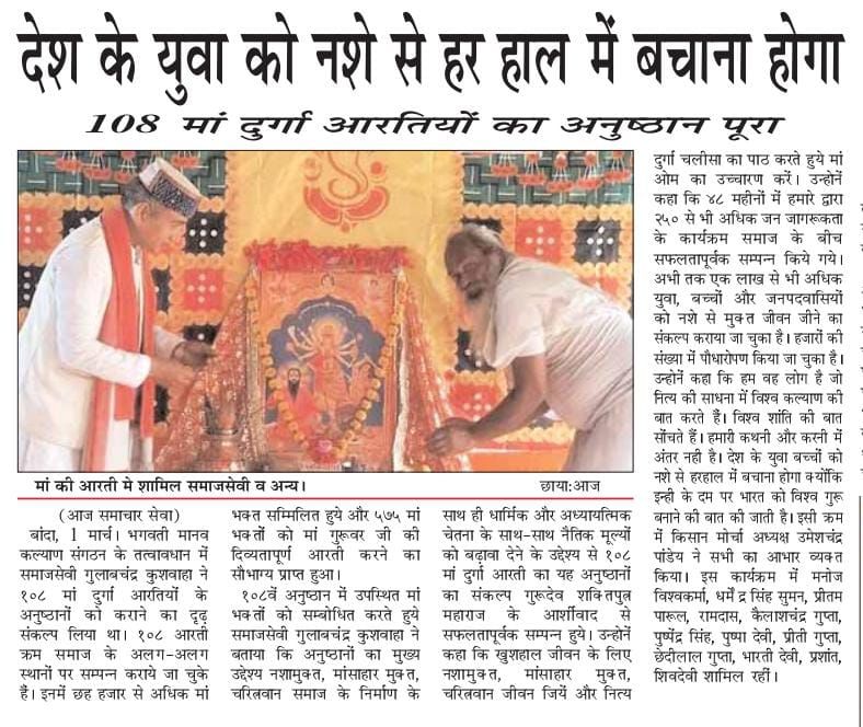 इस अभियान के अंतर्गत जिले के विभिन्न स्थानों पर 108 मां दुर्गा आरती कार्यक्रम आयोजित किए गए, जिनमें लगभग 6000 से अधिक मां भक्तों ने भाग लिया। इनमें से 575 भक्तों को मां गुरुवर जी की दिव्य आरती करने का अवसर प्राप्त हुआ। कार्यक्रम गुरुदेव श्री शक्तिपुत्र महाराज जी के आशीर्वाद से संपन्न हुआ।