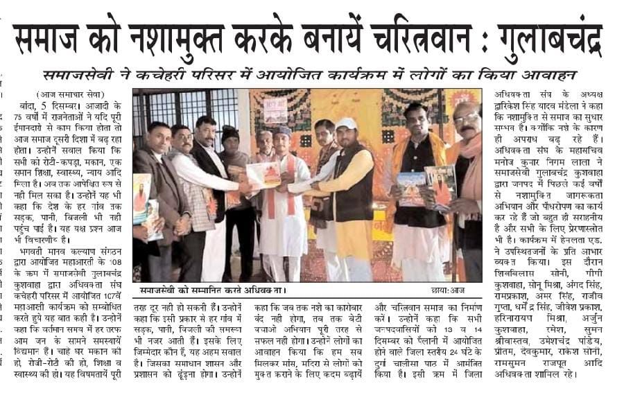 समाजसेवी गुलाबचंद्र कुशवाहा जी ने बताया कि उनके संकल्प का 107 वा आयोजन जिला अधिवक्ता संघ कचेहरी परिसर बांदा में संपन्न हुआ साथ ही 108 आरती क्रम व नशामुक्त हस्ताक्षर अभियान के संकल्प की श्रृंखला का आयोजन भगवती मानव कल्याण संगठन के तत्वाधान में कचेहरी परिसर में संपन्न किया गया.